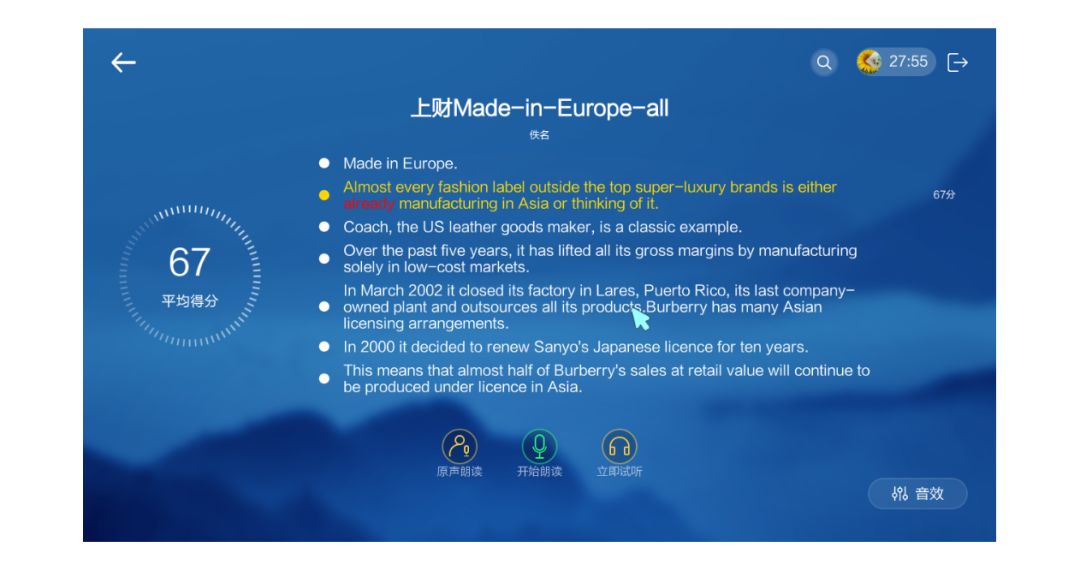 点开模块,选择文章之时,会看到文章右上角有“+”号,点击它会把文章添加到朗读单中。点击朗读单,就可以查看你添加到朗读单的文章。切换到已读,可以查看你已经朗读过的文章。