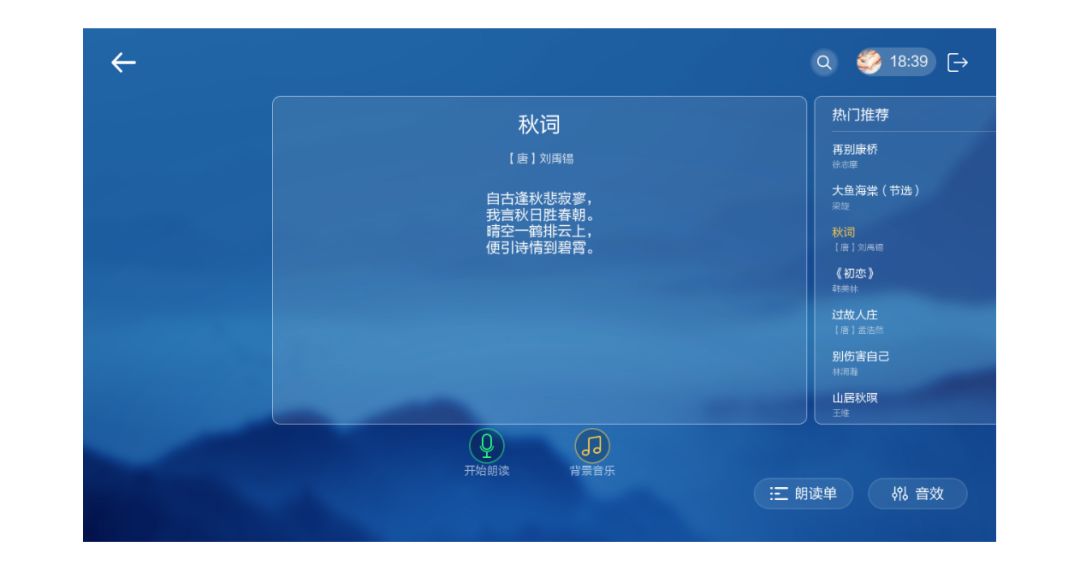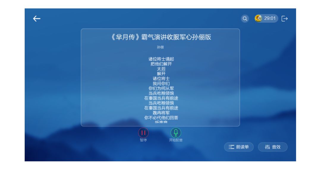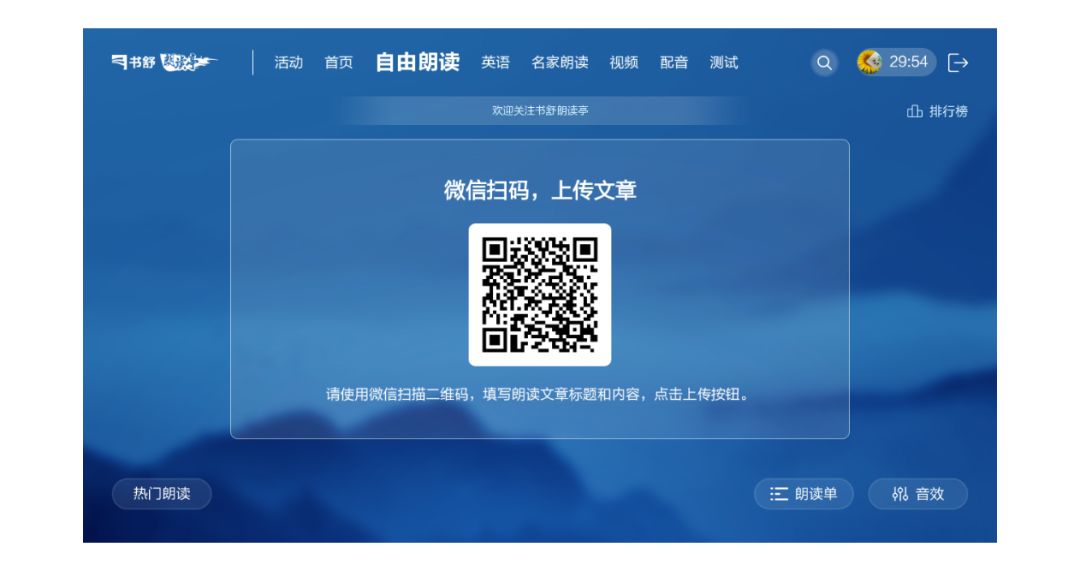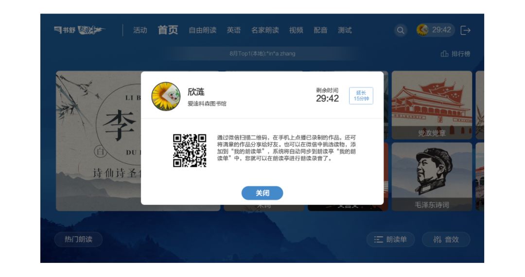 进入朗读亭,点击屏幕任意区域退出屏保,扫描二维码进行登录。