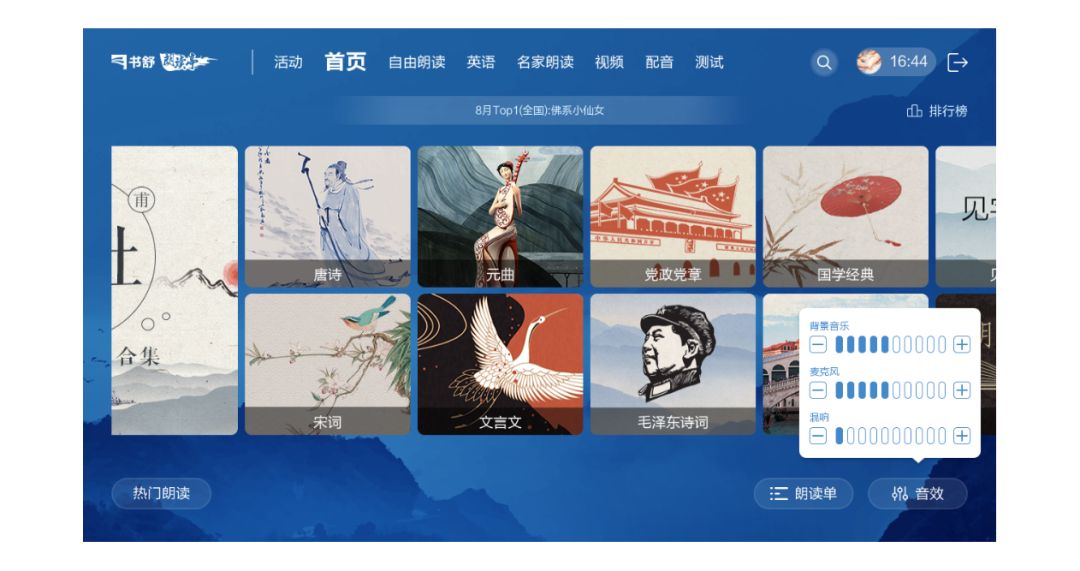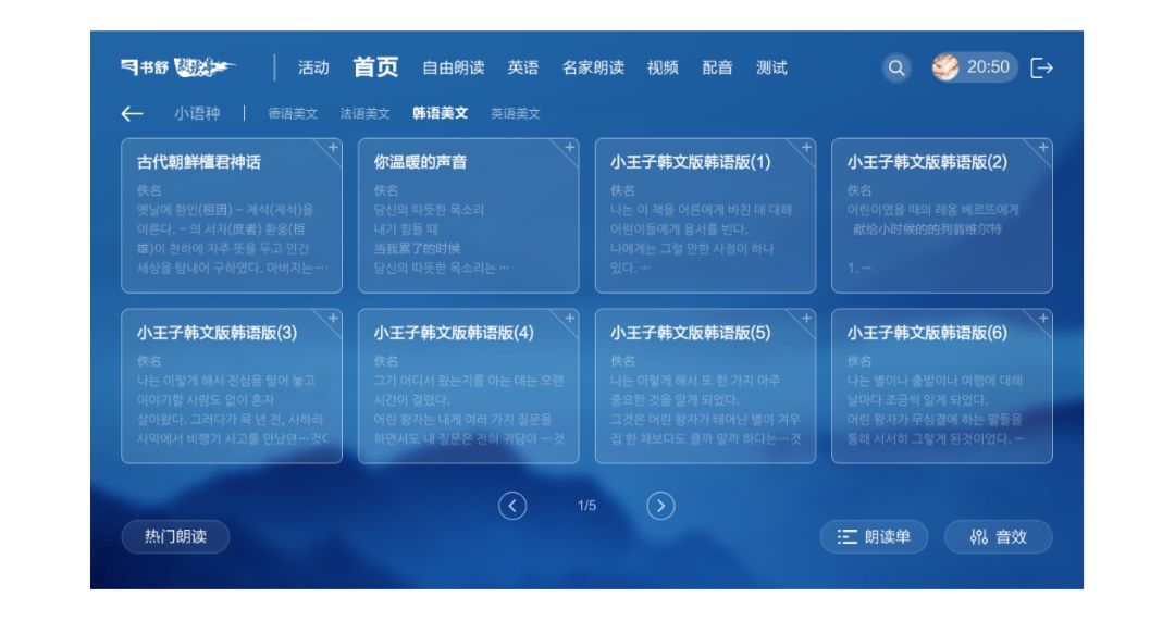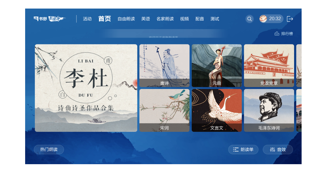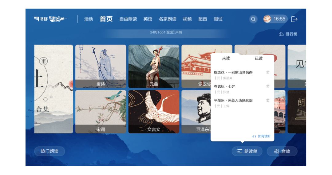选择首页,会显示运营模块,以及唐诗、宋词、元曲、文言文、小语种等模块,点击自己想要阅读的模块。