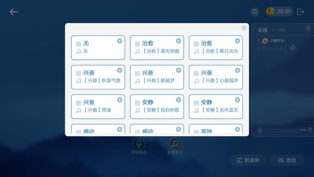 点击文章的类型为“自带读物”的时候,自己可以携带书籍进行朗读,也可以即兴发挥任意朗诵。
