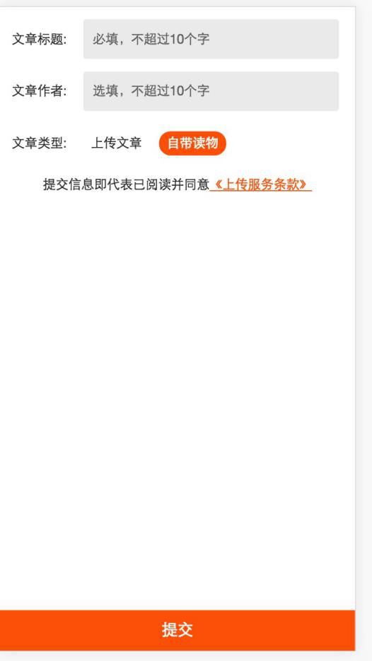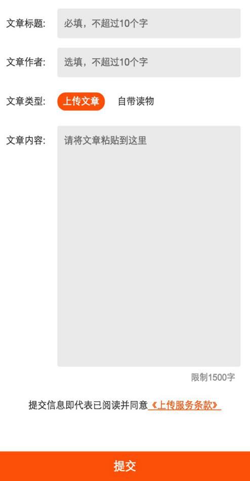 手机会显示上传文章的页面。文章类型为“上传文章”时,可以自己任意填写标题、作者和内容。所填写的信息会输入到朗读亭的显示屏上,从而来进行朗读。