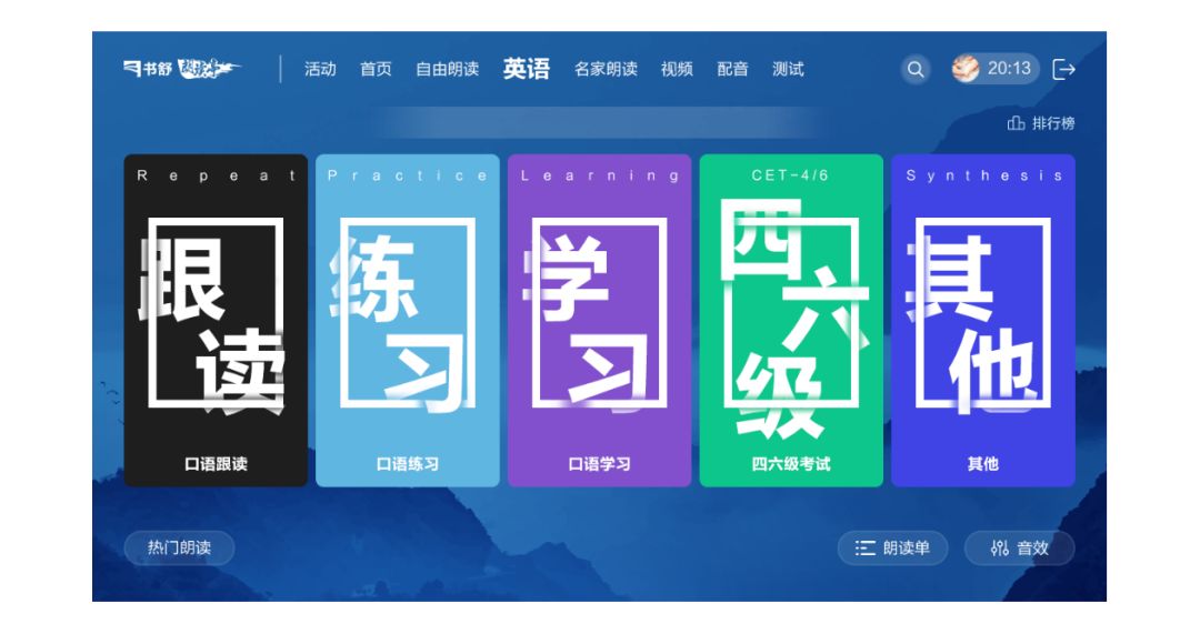 点击英语,可以选择跟读、练习、学习、四六级和其他(以跟读为例),点击跟读进入页面,选择要朗读分文章,进入后点击自己要朗读的语句。可以点击原声朗读或者开始朗读后,朗读结束后会有评分,发音不准确的单词会变成红色,还可以选择立即试听。