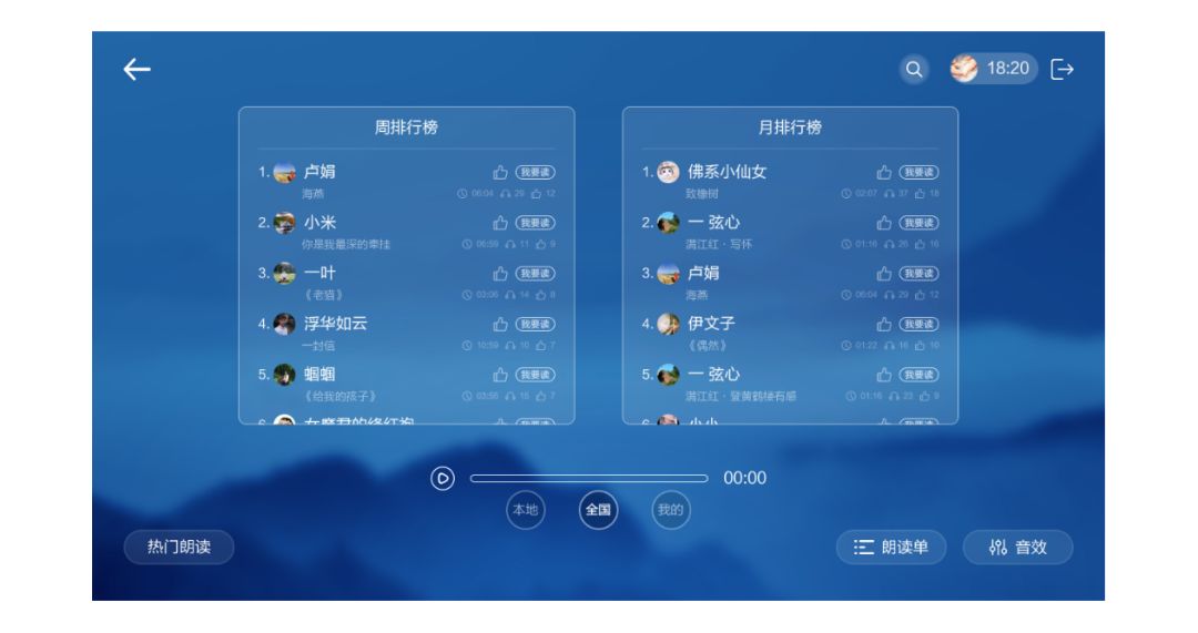 点击右上角的排行榜(或者首页的滚动字幕),就可以查看本地的周排行榜和月排行榜,全国的周排行榜和月排行榜,以及你自己朗读的文章的排行榜。