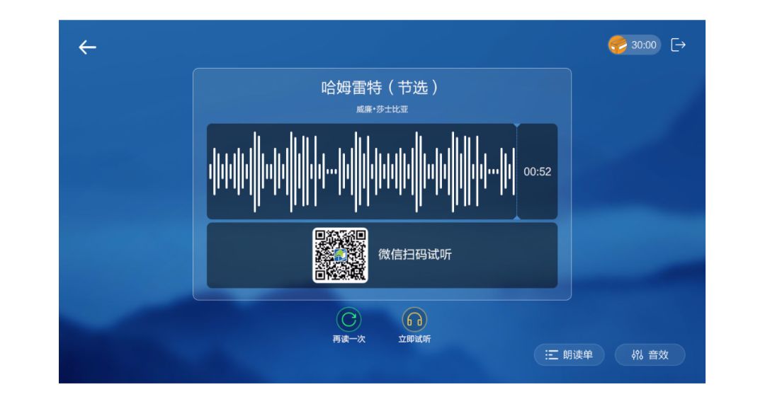 点击开始朗读,进入朗读界面既开始录音。录音之时可以选择重读和停止朗读,朗读时间超过10秒后点击停止朗读后,可以选择在线试听或微信扫码手机试听,手机试听还可以进行分享。