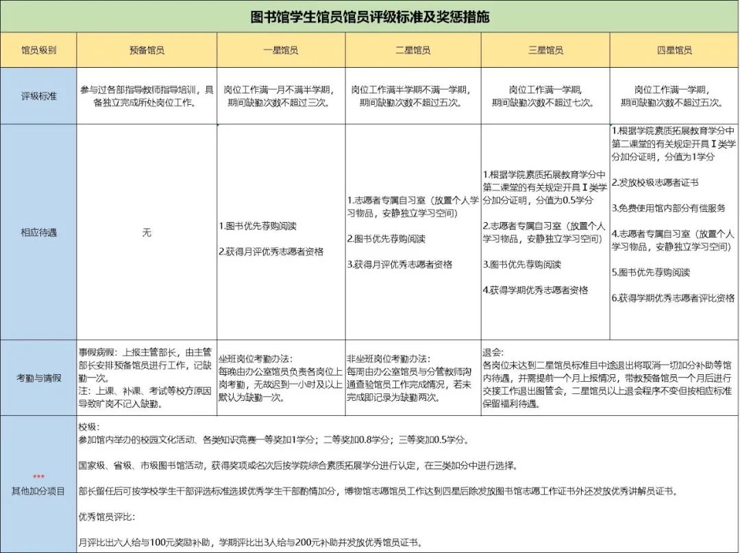 志愿馆员采取星级评定制度。一星志愿者:参与过各部指导教师指导培训,具备独立完成所处岗位工作。二星志愿者:岗位工作不满半学期。三星志愿者:岗位工作满半学期不满一学期。四星志愿者:满勤或一学期内缺勤次数在五次以内评定为评定为四星志愿者。根据星级给与学分、校级志愿服务证书、馆内设施使用等奖励。