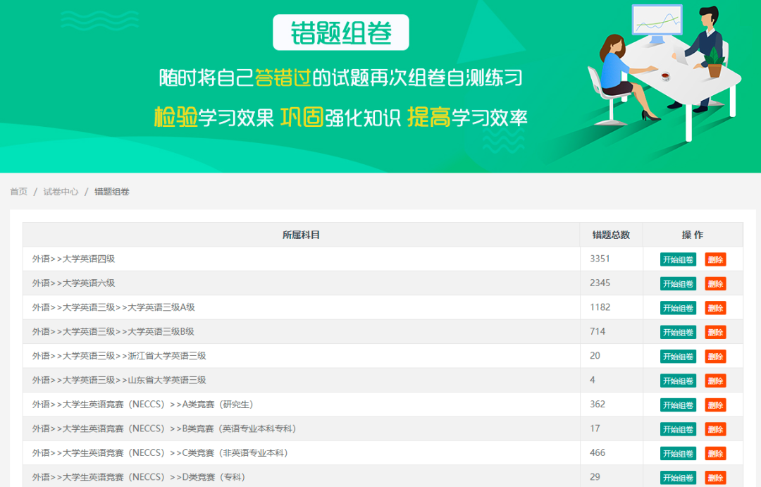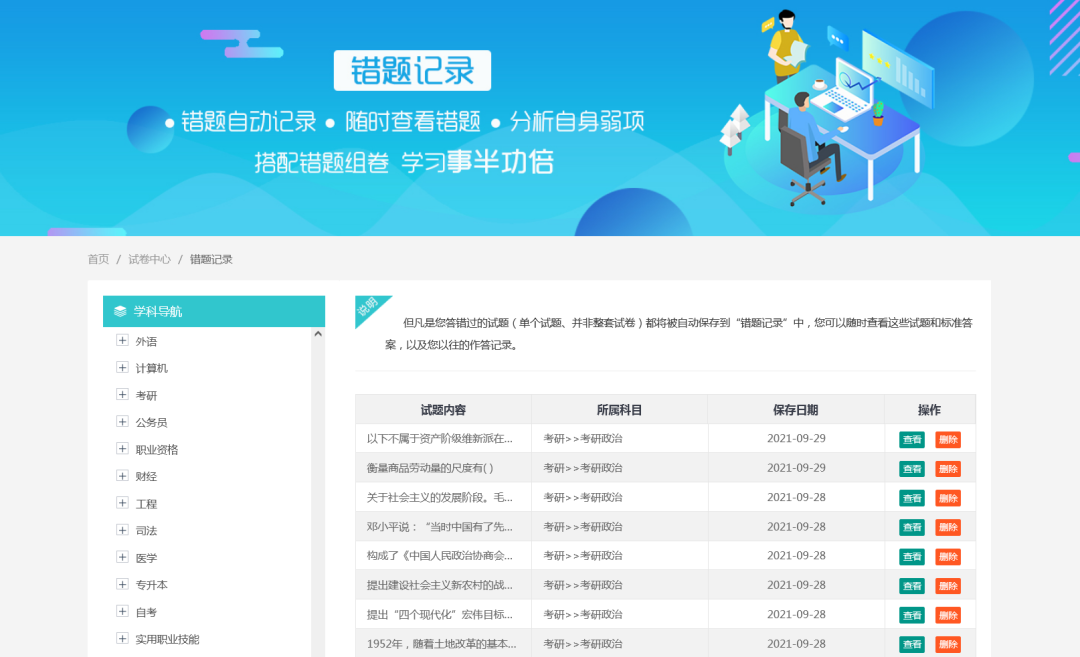 通过“错题组卷”功能,读者可以分科目、分题型查看自己全部答错过的试题,并抽选某一科目下的任意题型、任意数量的错题,将其重新组成一套试卷供自己练习。“错题组卷”功能对于检验读者对知识点的掌握程度、验证读者的学习效果具有很大帮助。