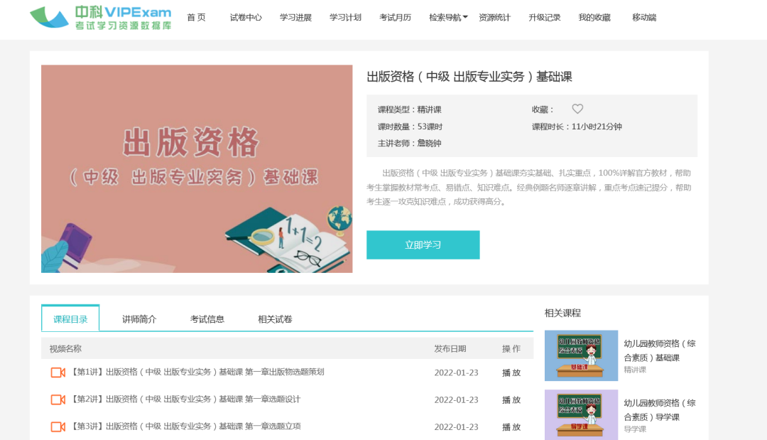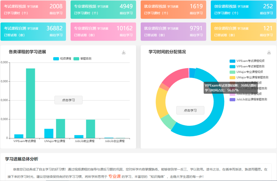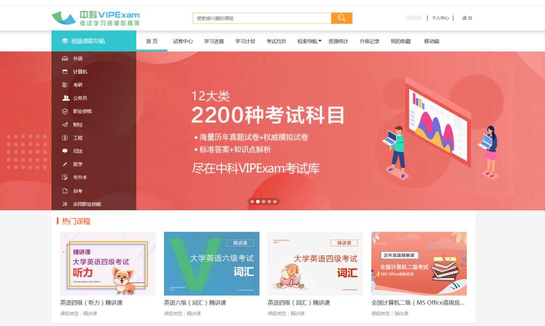 中科VIPExam考试库根据读者的学习目标与进度,统计分析读者的学习行为、时间分配、成绩曲线等数据,为不同复习阶段的读者进行智能化推荐视频课程、配套习题、相关知识点,帮助读者查缺补漏、量化了解自身学习进展,并最终形成系统化、全面化的知识体系。