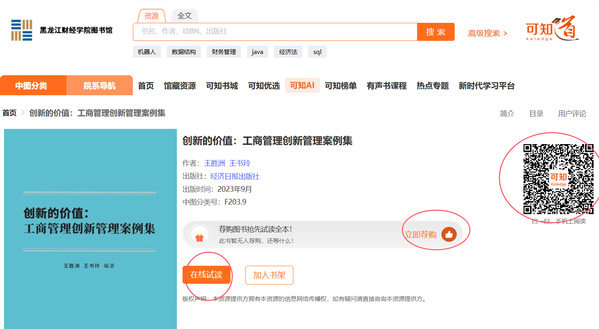 在查找到想要的资源后,可点击图书封面进入图书详情进行试读和荐购。