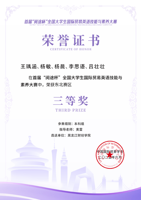 在首届“阅途杯”全国大学生国际贸易英语技能与素养大赛的激烈角逐中,我校王瑀涵、杨敏、杨晨、李思语、吕壮壮同学,在指导教师黄雷的专业引领下,从全国500余所高校、1700余组参赛队伍里脱颖而出,荣获东北赛区(本科组)三等奖!
