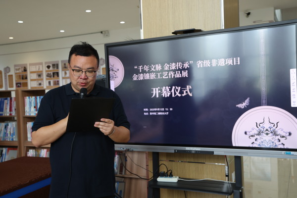 当千年非遗邂逅书香校园,当传统工艺对话青春学子,一场兼具文化深度与视觉美感的盛宴正式启幕,学校党委委员、宣传部部长皮天宇、黑龙江省非物质文化遗产金漆镶嵌工艺传承夏立军、白艳萍、章杨丽、叶剑等出席活动,图书馆馆长王春玲主持开幕式!12日下午,“千年文脉 金漆传承”金漆镶嵌工艺作品走进龙江高校图书馆巡展,重磅登陆黑龙江财经学院图书馆,为全校师生带来了一场沉浸式的传统文化体验。
