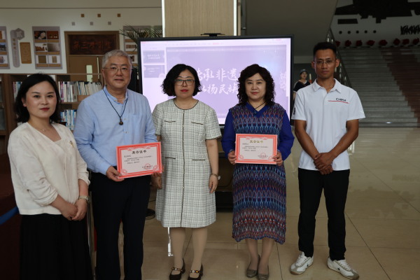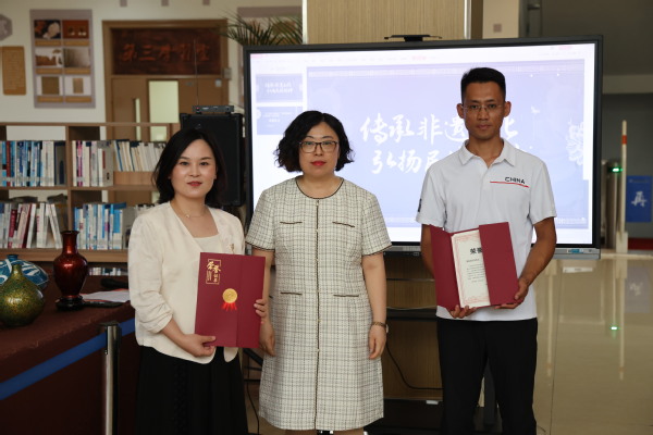漆器捐赠,文脉永存:夏立军、白艳萍老师向图书馆捐赠脱胎漆器作品《赤宝砂梅瓶》。王春玲馆长为两位老师颁发收藏证书。