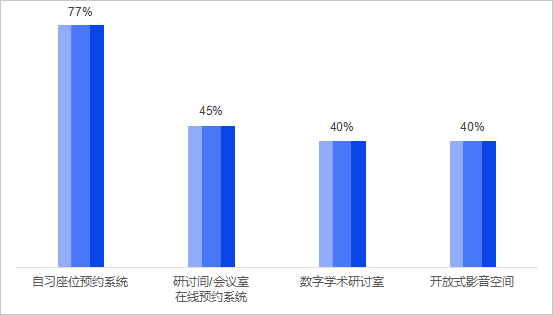 学生最期待的智慧化设施为:自习座位预约系统(77%以上);研讨间/会议室在线预约系统(45%);数字学术研讨室(配备智能屏、协作软件)(40%);开放式影音空间(40%)。